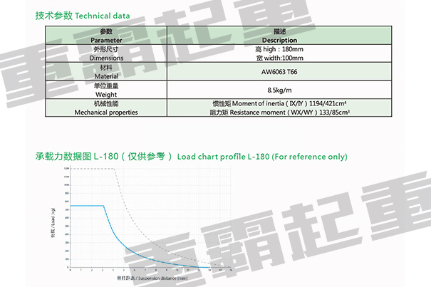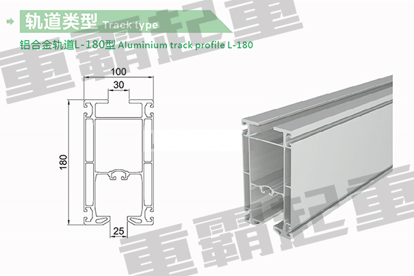 L型鋁合金軌道外形尺寸是180*100mm,每米重量8.8KG,在3米跨度之內(nèi)載重750KG,超過3米跨度,載重量會隨著跨度的變化而變化,在設計載重量的時候請咨詢重霸起重專業(yè)人員。