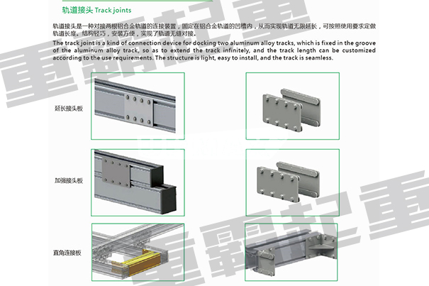 軌道接頭是一種對接兩根鋁合金軌道的連接裝置,固定在鋁合金軌道的凹槽內(nèi),從而實(shí)現(xiàn)軌道無限延長,可按照使用要求定做軌道長度。結(jié)構(gòu)輕巧,安裝方便,實(shí)現(xiàn)了軌道無縫對接。